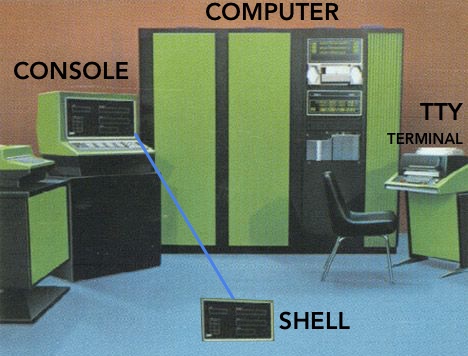 A diagram of an old computer is helpful in understanding the differences between a 'terminal', a 'shell', and a 'console'